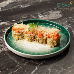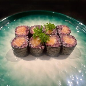 Salmone, philadelphia, avvolto da tartare di salmone piccante, gomasio, salsa teriyaki (8 pz.) – Piccante