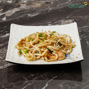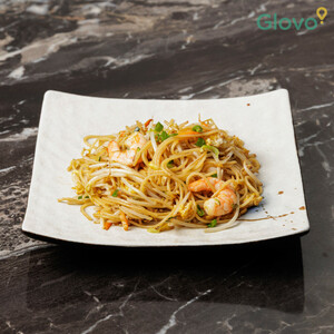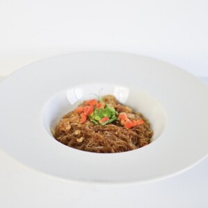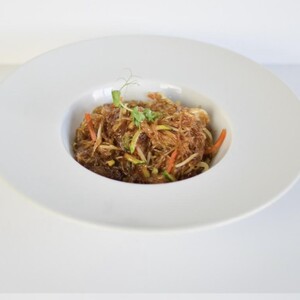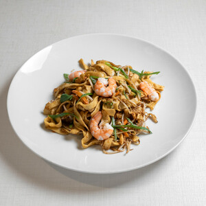 Tagliolini (pasta con uova) saltati con verdure e gamberi
