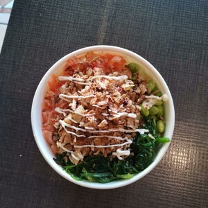 Riso, tartar di salmone, alghe wakame, edamame, cipolla fritta, maionese, teriyaki