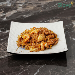 Riso saltato in sala di soia, uova, pollo e gamberi
